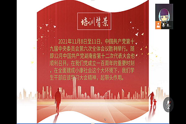 课上,主讲人首先播放了十九届六中全会视频节选,帮助学员了解了十九届六中全会精神。随后通过播放视频,引入湖南省第十二次党代会精神的主题,并就学生干部如何将会议精神融入日常学习工作进行了细致地讲解。