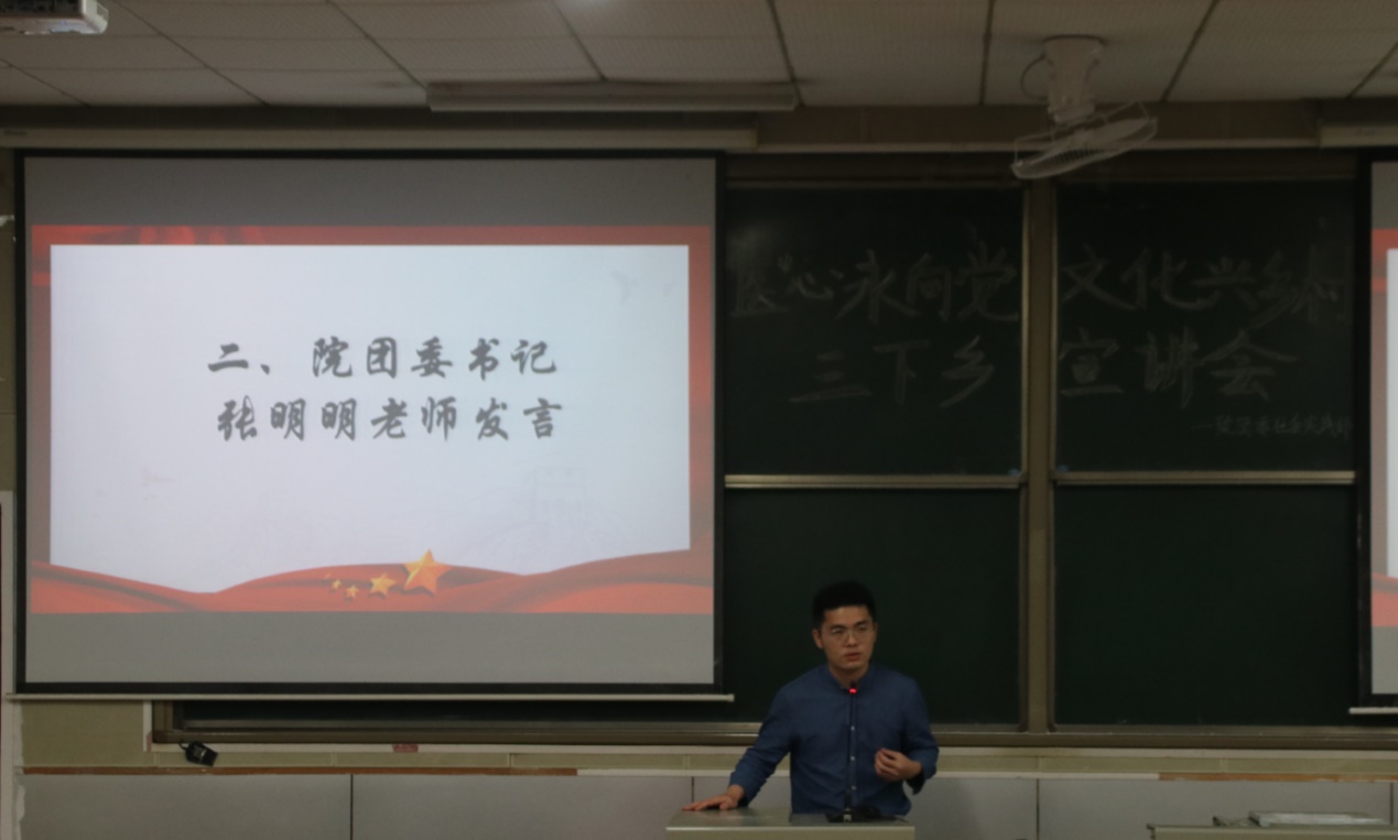 张明明从习近平总书记在建团100周年上发表的讲话以及建设美丽中国、建设美丽乡村出发,向同学们发出号召,希望同学们积极投身“三下乡”,充分发挥自身专业知识,到农村去、到基层去,展现当代青年人的使命和担当。