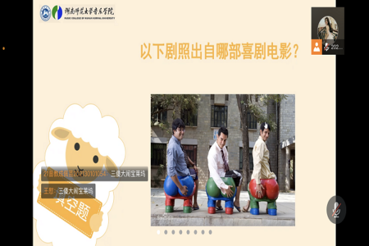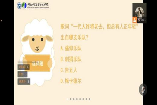 此次活动共分为声乐类、器乐类、舞蹈类、吉他类、喜剧类五大主题,题目类型为选择题、填空题。主持人按照主题顺序进行提问,社团会员在聊天框进行回答,工作人员对回答情况进行统计,每道问题选取前五名发送正确答案的社团成员进 行积分。会员们积极参加,踊跃答题,理事会成员根据社团会员答题情况,共评选出一等奖1名, 二等奖2名,三等奖6名。