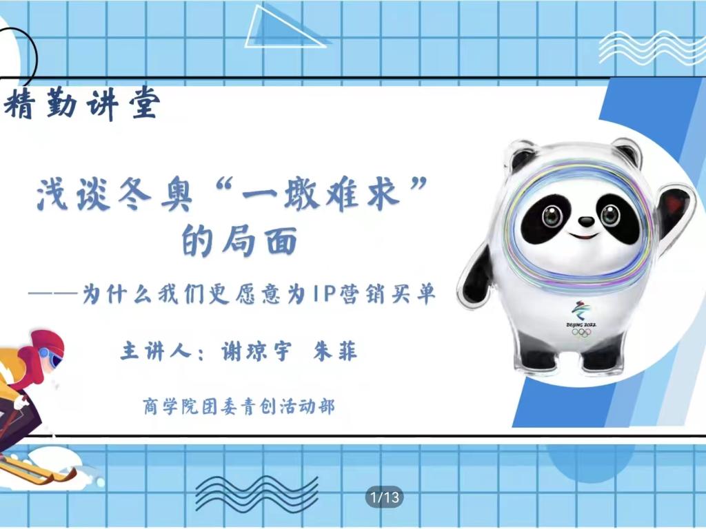(通讯员 谢孟洁 宋欣)4月28日中午,商学院青年创新创业指导中心活动部于线上开展“浅谈冬奥‘一墩难求’的局面”主题活动。19级国贸专业朱菲和19级会计专业谢琼宇担任主讲人。青创活动部干事谭楚凡担任主持人。