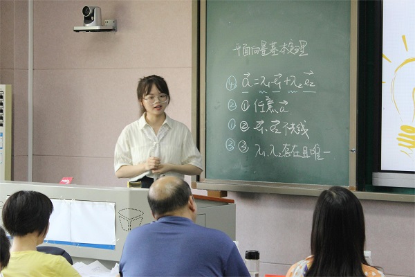 选手们依次展示后,评委老师为选手综合打分,谢美丽对选手的表现进行总结点评。她认为,选手们准备充分,教学环节完整,可以熟练运用现代化教学工具进行数学实验。谢美丽强调,大家在口头表述的过程中,要做到精准,精简,精美,即用生动简洁的语言以及漂亮的板书精确表述出数学概念。此外,她还表示自己很高兴担任本次比赛的评委,期望大家能够再接再厉,逐步提升自己的师范技能。