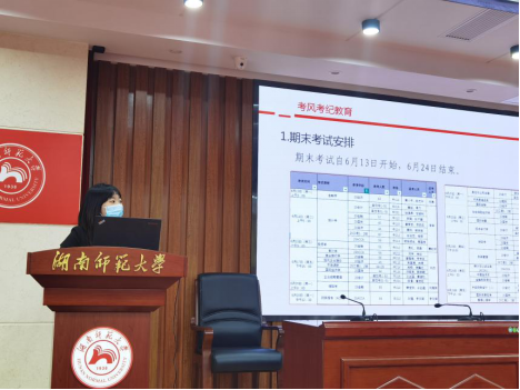 会议开始,骆芷蓉对本学期期末考试日程安排进行详细介绍,提醒同学们按时参加考试。同时,她着重强调了考风考纪,画清纪律底线,并明确指出对于舞弊行为将依照校规进行严肃处理。此外,骆芷蓉给同学们宣读了学院新出台的学业预警政策,督促各位同学端正学习态度,按时高质量完成学业课程。