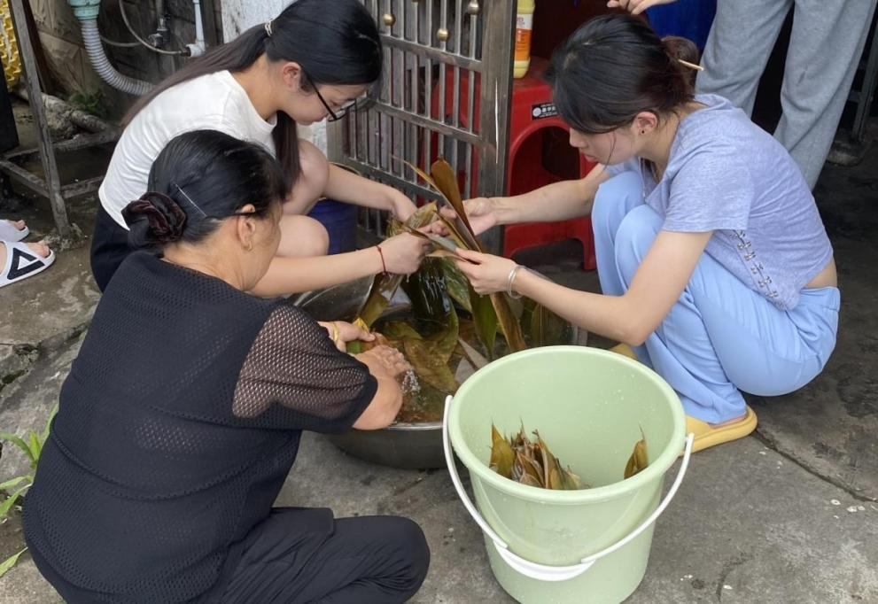 一片碧绿,一根草绳,一缕清香包裹的是传承百年的味道。走进卢桂香老人家中,队员们热情地和老人们打招呼。在厨房内,大家把事先准备好的箬叶放进大盆内,一片片箬叶在志愿者和老人们手中翻转、冲洗,呈现着一片忙碌景象。