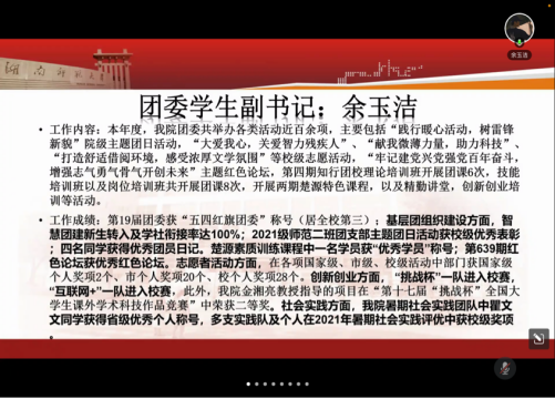 校团委“区校共建”项目部负责人罗昭文,校学生会主席团成员刘婷婷,院团委学生副书记余玉洁,院学生会主席团成员李俊、王昭怡、律雅宣,院学生社团管理服务中心主任盛语嫣,院青年传媒中心主任黄心如及各部门、校委员代表共十三名学生干部进行述职。他们从各学生组织举办的活动、取得的成绩等方面汇报了学年之内的工作,总结了工作的意义,并反思不足之处,表示在今后的工作中也将毫不松懈,更好地投入为广大师生的服务中去。