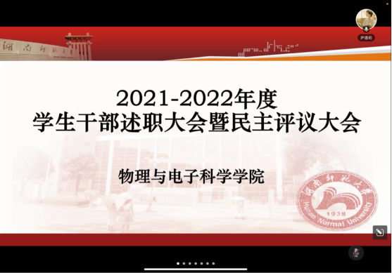 (通讯员 蔡韬 刘毅)4月6日中午,物理与电子科学学院于腾讯会议线上举行2021-2022年度学生干部述职大会暨民主评议大会。院党委副书记郭铭伟和学工办全体老师出席此次会议。2021级物理二班尹德莉担任此次大会主持人。