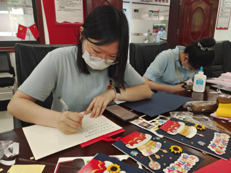 活动伊始,社区工作人员有序分发制作材料,数统院志愿者通过观看视频的方式学习制作康乃馨,他们运用剪刀将皱纹纸剪裁成花瓣的形状,并将其粘贴到对应位置,再依次制作花蕊及花柄,最后精心挑选出其中30朵康乃馨赠予老人。同时,志愿者们制作生日贺卡,手写生日寄语,统一分装生日礼物,传递爱与祝福,获得了社区工作人员的认可。