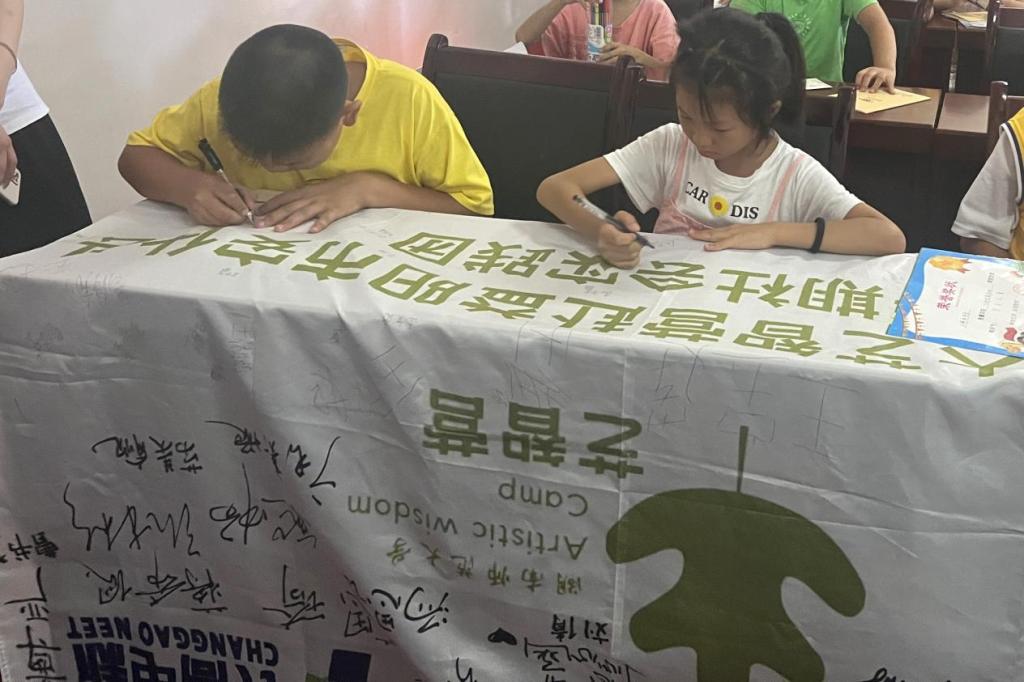 学生们在队旗上签名