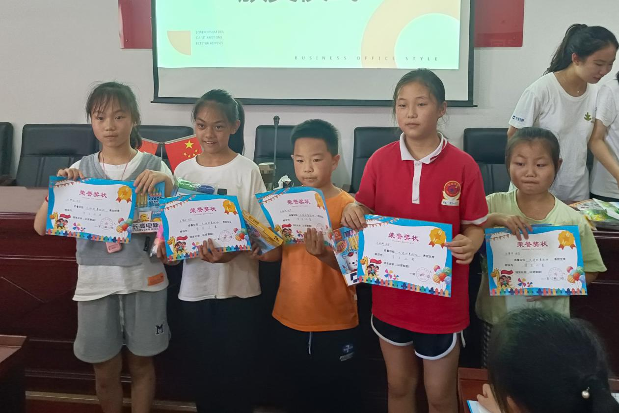 结班仪式早早开始。村委主任代表夏波率先发言,她肯定了此次支教的效果和意义,并希望将此活动延续下去。艺智营队长刘尊严以及队员代表分别发言,感谢孩子们的积极配合与家长们的信任理解,并为他们送上了最真挚的祝福。讲话完毕后,艺智营队员为孩子们赠送纪念礼品,为表现出色的学生颁发奖状和奖品。全体师生集体朗诵诗歌《我喜欢红色》并合唱歌曲《宁夏》,展示此次暑期支教活动的成果。合唱过程中,学生们纷纷与队员们拥抱,以此表达对队员们的不舍。全体队员还与学生在队旗上签名留念,一起在大坪村村委会门前留下珍贵的合影。至此,为期十五天的暑期社会实践活动正式结束。