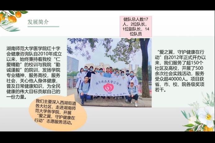 活动开始,主持人向大家简要介绍此次活动的主要流程。接着,聂徽从发展简介、活动内容、日常培训等方面依次对健康咨询队进行介绍。该队伍自2010年成立以来,始终秉持着我校“仁爱精勤”的校训与医学院“勤诚谨毅”的院训,为社区及高校服务,发扬学院专业精神,并多次获得校级、院级奖项。