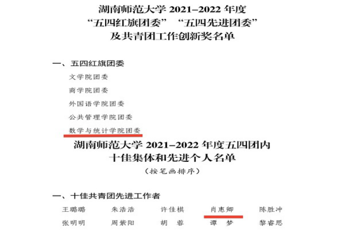会上,数学与统计学院荣获先进集体与优秀个人等多项表彰。其中数学与统计学院团委荣获“校五四红旗团委”,数统院团委副书记,团委会指导老师肖惠卿作为“校十佳共青团先进工作者”接受表彰。此外,学生章寒露获“校十佳共青团员”;学生赵安宇获“校十佳学习标兵”;学生罗佳杰获 “校十佳创业标兵”;学生黄瑞华获“校十佳文体之星”。
