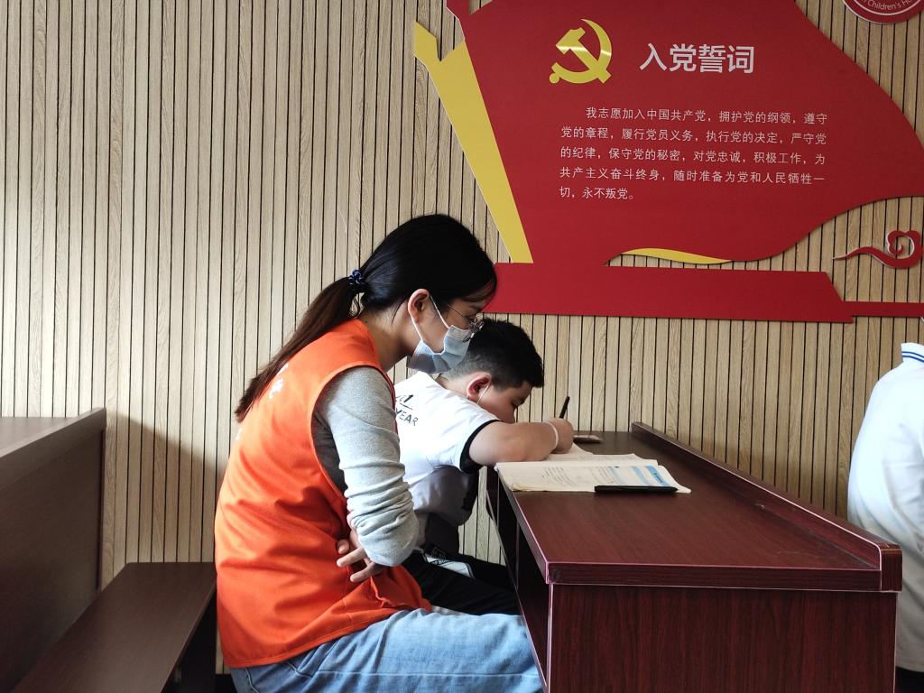 志愿者带领儿童温习课本知识