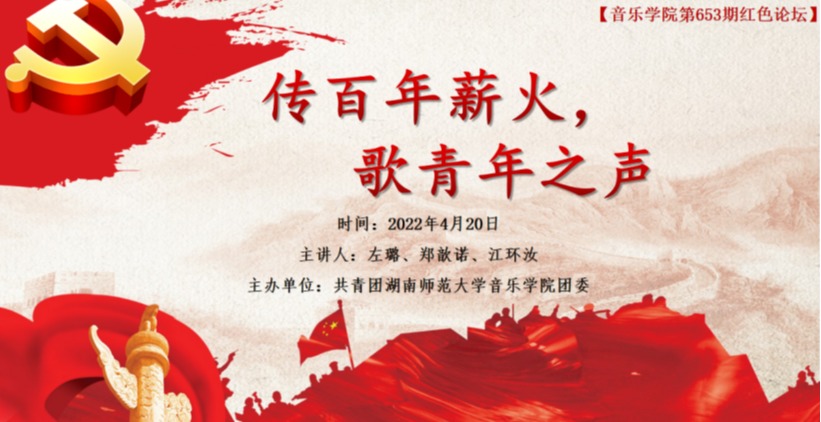 (通讯员 郑歆诺 姚苏萌 狄燕文)为深入学习共青团团史,音乐学院于4月20日开展以“传百年薪火,歌青年之声”为主题的线上红色论坛活动。此次活动由狄燕文主持,左璐、郑歆诺和江环汝主讲。音乐学院学工办主任、2021级辅导员陈芳老师,音乐学院团委负责人、2018辅导员李思达老师,2020级辅导员戴霁斌老师,2019级辅导员张行老师出席此次活动,音乐学院青年学生代表参加。