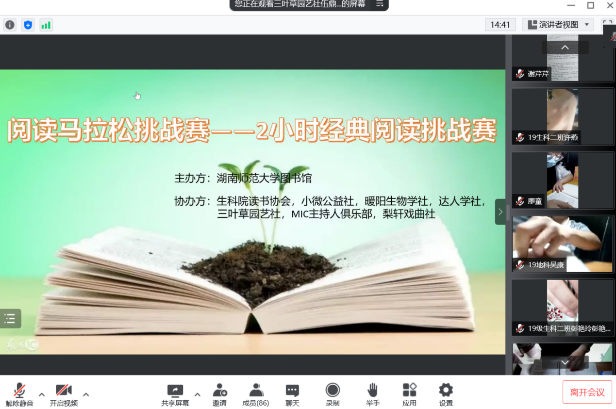 (通讯员 卢佳佳 郭英美)5月22日下午,生命科学学院读书协会、暖阳生物学社、三叶草园艺社、达人学社、小微公益社、太阳成集团tyc图书馆、文学院梨轩戏曲社与新闻与传播学院MIC主持人俱乐部于腾讯会议联合举办湖师大第三届麓山阅读马拉松挑战赛第二程活动“两小时经典阅读挑战赛”。生科院三叶草园艺社理事伍鼎载担任主持人。