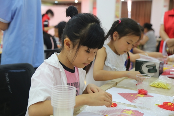 答题过后,志愿者们引导小朋友们制作中秋花灯和拼接爱国钥匙扣,并帮助他们完成加热、扣环的部分。志愿者们还向他们发放一个石膏娃娃、刷子、颜料,协助其完成涂色任务。志愿者们积极与他们互动,参与活动的小朋友们热情高涨,很好地调动了现场气氛。