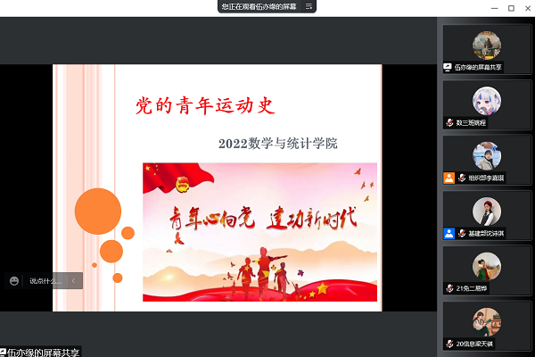 (通讯员 姚程 匡家慧)4月27日中午,数学与统计学院(以下简称“数统院”)团委组织开展主题为“党的青年运动史”的线上学习活动。数统院团委组织部志愿者伍亦缘担任此次学习活动主讲人。