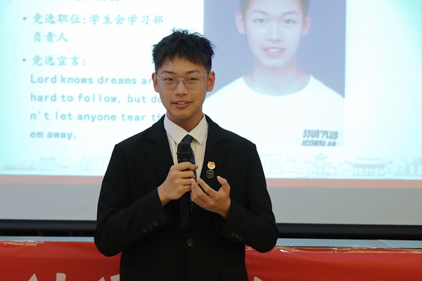 第二十一届团委会、学生会委员候选人发表竞选宣言。候选人根据抽签顺序,依次上台进行演讲,向与会代表展示个人优势和未来部门规划。