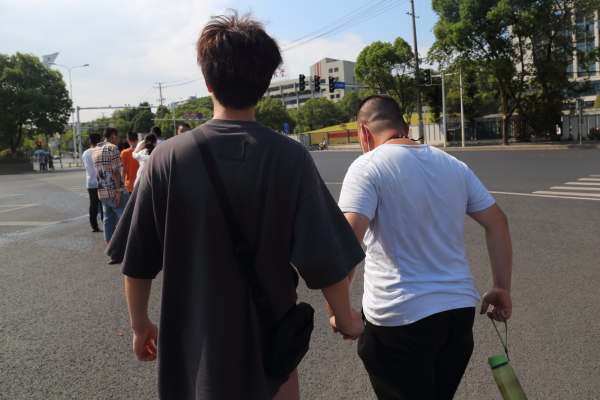志愿者护送学员过马路
