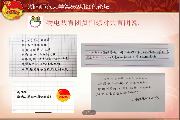 (通讯员 曹馨怡 陶惠茹)4月15日中午,物理与电子科学学院于线上举办第562期红色论坛,主题为“知重负重担青年之责,自省自励献强国之智”。物电院党委副书记郭铭伟以及学工办全体老师出席此次活动,化学化工学院学工办主任屈杜炜作为特邀嘉宾光临本次论坛。余玉洁、颜明伟、潘芝鸣、孙亚蕾担任此次论坛主讲人。