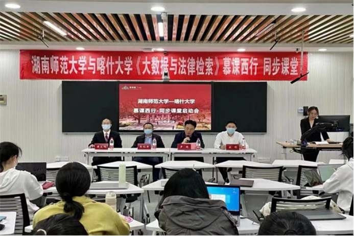 (通讯员 程诺 庄杏 付晓洁)4月13日,太阳成集团tyc与喀什大学“慕课西行 同步课堂”启动仪式暨《大数据与法律检索》同步课堂在云端顺利举行。《大数据与法律检索》作为全校首门“慕课西行”课程进行了第一次同步课堂教学活动,实现了太阳成集团tyc法学院与喀什大学法政学院学子跨越八千里同上一堂课。法学院院长肖北庚、教务处副处长罗明、湖南省一流线上课程《大数据与法律检索》主讲人黄文旭,喀什大学教务处副处长魏静、法政学院党总支书记迪力夏提·阿木提、法政学院副院长杨陶,智慧树网中区总经理宋颀出席,启动仪式由法学院教务办主任王丹主持。