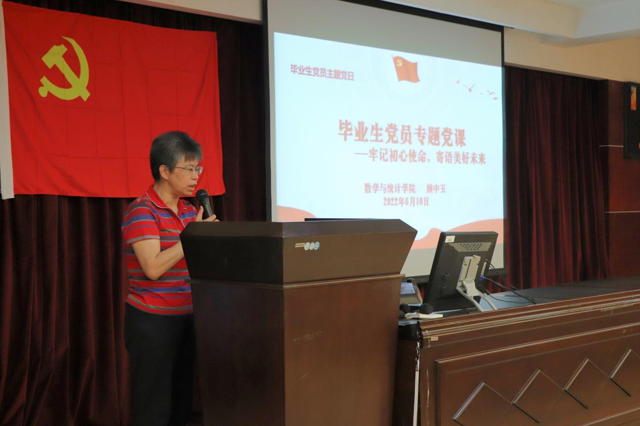 (通讯员 石卓 杨震坤 曹慧娟)6月10日下午,数学与统计学院毕业生党员主题党日活动在格物楼309报告厅举行。学院党委专职组织员覃志斌老师主持活动。学院党委书记颜中玉、副书记涂榉耀,党委委员、“计算与随机数学”教育部重点实验室副主任刘亚琴,党委委员、院组织人事秘书林虹,学工办主任李俐,院党委组织人事秘书熊绍英(前)出席此次活动。