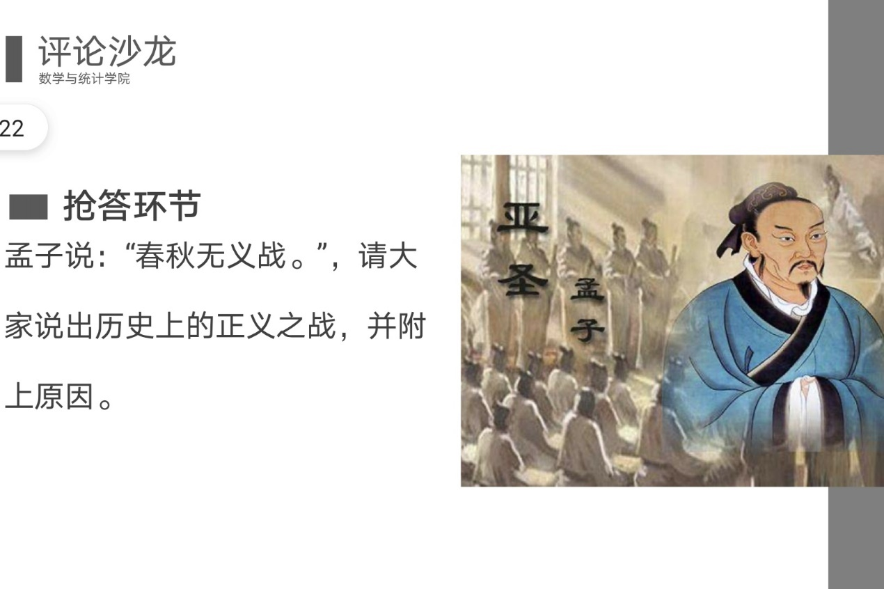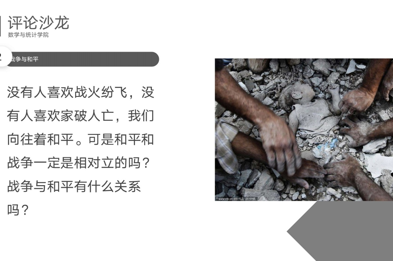 (通讯员 安羿瑾 何粤)3月17日中午,数学与统计学院团委会青年传媒中心文艺评论部(以下简称“文评部”)于线上开展评论沙龙。此次文评沙龙以“战争与和平”为主题,由文评部评论员王毅恒担任主讲人。