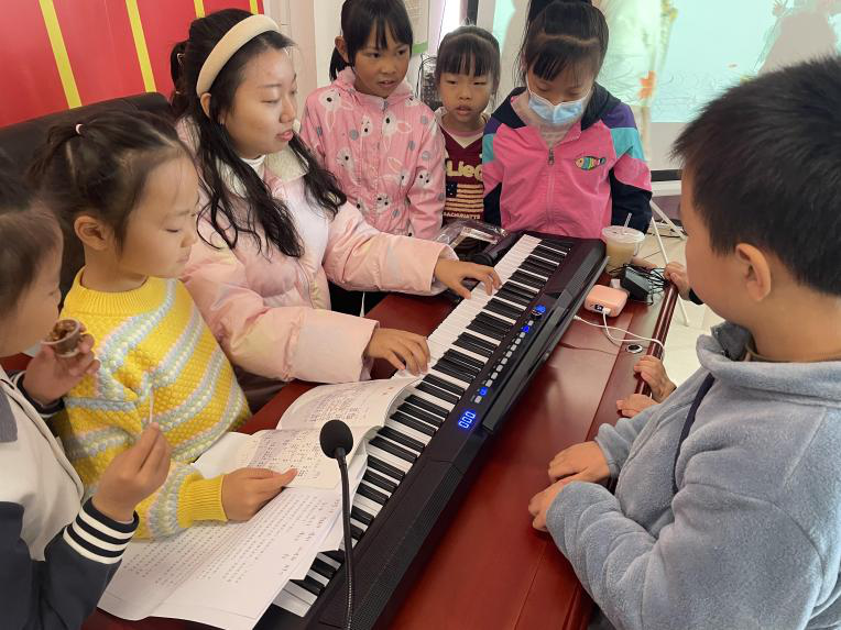 孩子们热情围在志愿者身旁聆听歌曲