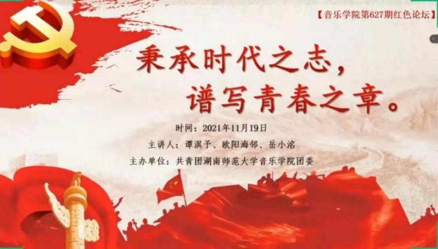 (通讯员 郑歆诺 姚苏萌 雷淇)为深入学习习近平总书记“七一”重要讲话精神,音乐学院于11月19日开展以“秉承时代之志,谱写青春之章”为主题的线上红色论坛活动。此次活动由欧阳海邻,谭淇予,岳小洺主讲。学院学工办主任、2021级辅导员陈芳,学院团委书记、2018级辅导员李思达,2020级辅导员戴霁斌,2019级辅导员张行出席此次活动。音乐学院青年学生代表参加。