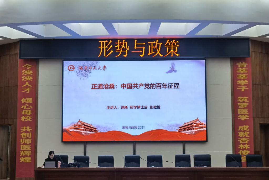 (通讯员 廖映 戴思 刘鼎扬)12月1日晚,医学院于仁医楼学术报告厅开设了形势与政策课程。此次课程主题为正道沧桑:中国共产党的百年征程”,我校马克思主义学院哲学博士后徐新担任主讲人,21级检验班和药学班同学参加此次课程。