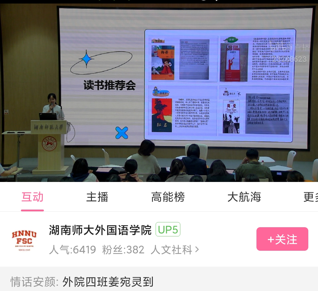 汇报会上,外院六支实践队伍依次进行成果展示。六支队伍的选题涉及英语教育、公示语翻译、红色文化传播等各项内容。各队采取PPT讲解,情景表演等多种方式,展示了他们的实践过程、成果及感悟。整个会场洋溢着热烈的气氛,直播平台互动积极,人气值高达6000。