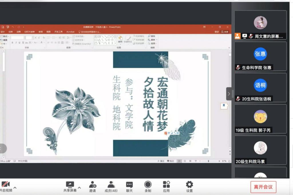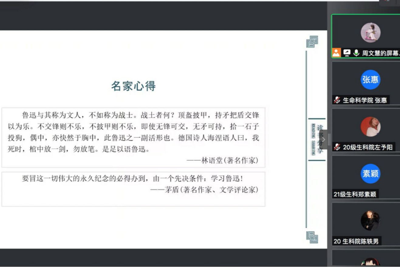 (通讯员 张惠)10月18日中午,生命科学学院、文学院与地理与科学学院于线上联合举办1+1读书会之“宏通朝花梦,夕拾故人情”活动。地科院周文慧担任此次活动主持人,评论员共同探讨鲁迅及其散文作品《朝花夕拾》。