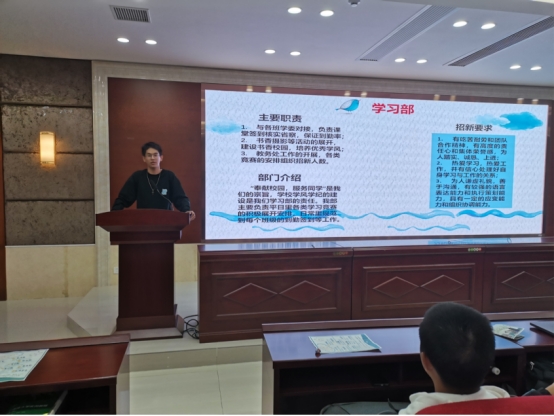 招新宣讲之前,四大团学组织各部门负责人精心准备好宣讲ppt和海报,方便21级新生更直观地了解各个部门,以便根据自身能力和兴趣进行选择。宣讲过程中,各部门负责人依次上台宣讲,通过展示活动照片和放映宣传视频的方式对部门特色进行介绍,并结合自身经历分享了从事学生工作为自己带来的改变与提升。紧接着,各部门阐述了招新要求,并针对新生们提出的问题进行解答。宣讲结束后,新生们纷纷表示感受到了各部门的热情和其独特的魅力,会积极踊跃地参与到招新报名中去。