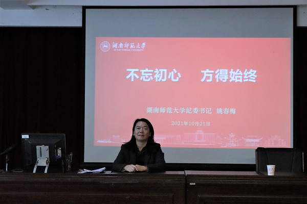(通讯员 曹慧娟 黄思颖 郭校语)10月21日下午,校党委委员、纪委书记姚春梅于数学与统计学院格物楼309报告厅作主题报告。数统院党委书记颜中玉担任主持。