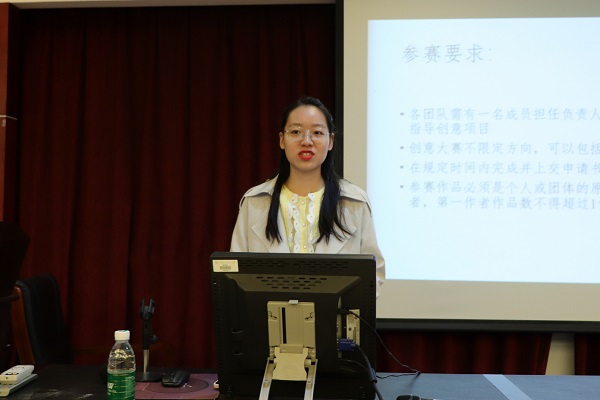 邓元园主要介绍了参赛要求与参赛内容。她介绍,大赛参赛组别分为创意组和实物组:创意组需要利用互联网技术或结合科学原理,主要为科学研究方面的巧妙设想。实物组主要为旧物改造或改良产品,可以适当加入科技元素以提高用户体验。此外,她强调了大赛的四点要求:想法创新、产品实用、方法有效和可行性强,并结合自身经历鼓励学生积极参与创新大赛,在实践中锻炼和提升自身能力。