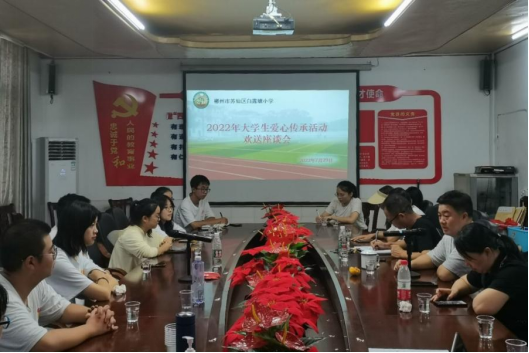 (通讯员 陈湘君 赵曼 刘智慧)7月29日下午,生命科学学院三叶草园艺社赴郴州市苏仙区白露塘小学暑期社会实践团与白露塘小学校委会成员开展2022年大学生爱心传承活动欢送座谈会。白露塘小学校长首林峰担任主持人,副校长李吉斌、副校长唐容容、教务办主任文斌、政教处主任陈俐璇、后勤处主任吴代万、办公室主任张红娟、少先队辅导员李思琪出席此次会议。
