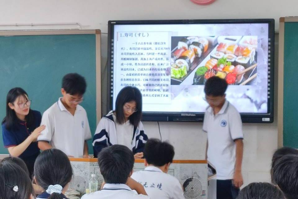 在美食中领略别致风俗,在唇齿间感受异国文化。李蔡浚与夏文媛通过介绍学生们熟悉的常用日语导入课堂,激发学生的参与课堂的积极性,活跃课堂氛围,在此基础上围绕日本的饮食文化、服饰文化、生活传统、名胜美景、特色产业等五个方面进行介绍。为提高学生的课堂参与度,锻炼实践动手能力,李蔡浚和夏文媛分别开展课堂小活动,邀请学生现场制作寿司并品尝日本美食。学生们以饱满的热情积极参与,在老师的指导下、同学之间的合作中完成实践操作。
