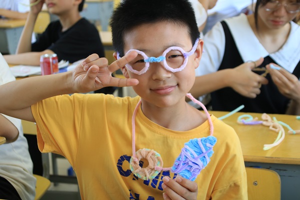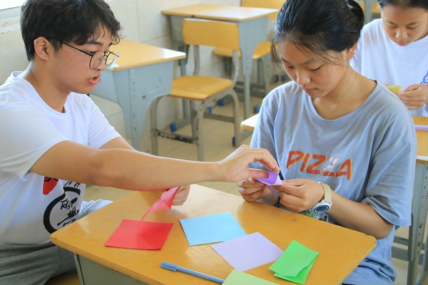 在课堂上,支教组的队员首先为大家带来了精彩的手工课。其中,组长邓添引介绍了折纸的基本方法,并耐心指导同学们折纸,最后进行了作品展示以及评选。组员李敏演示了扭扭棒的创作方法,并鼓励同学积极思考,勇于创新,同学们表现踊跃。随后,组员贺志飞用巧妙的方式给同学们展示了数学的趣味性,他把生活常识和医学知识融入到数学教学中,给同学们带来了不一样的体验。