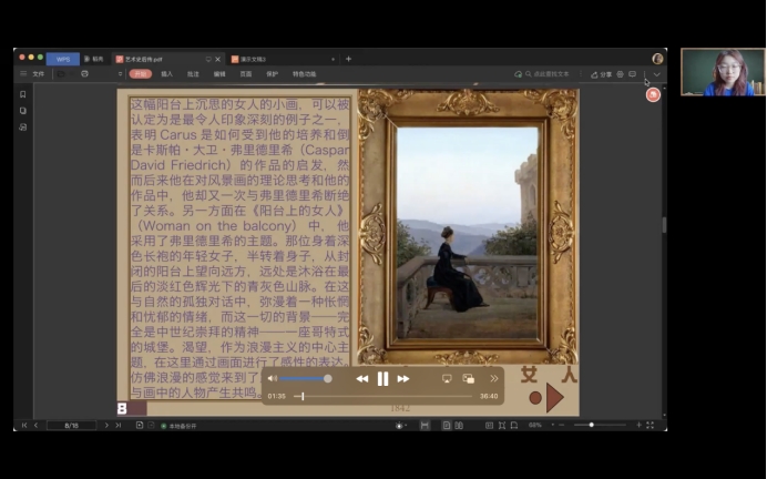此次艺术史讲堂从这幅名为《阳台上的女人》的油画导入,带领同学们分析画面体现的浪漫主义。王雅雯为激发同学们对艺术史的好奇心,创新教学模式,引导学生主动思考想象,通过对画作多元化的解读引出绘画作品背后的故事,进而让同学们认识作品背后的艺术家。她将画作从风格上区分开,加深同学们对艺术史完整脉络的印象。