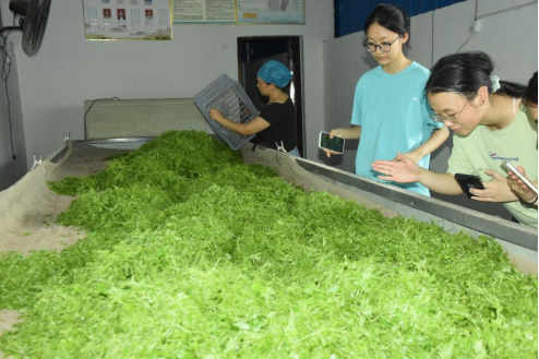 调研团成员们来到了垕王村莓茶加工厂拜访基地负责人。他向我们介绍了莓茶加工的一系列过程:晾晒,杀青,揉捻,松包,烘干等。负责人还向我们介绍了莓茶的不同种类,为我们泡了“春茶”“短茶”“夏茶”等几种莓茶以品尝。接着,负责人讲述了他从2019年回乡创业建厂、振兴乡村的经历。团队成员们了解到垕王村的年轻力量大多外出务工,留在村里的多为老年人。负责人表示他聘请老人家采摘茶叶进行挑选,以帮助垕王村留守村民们补贴家用。厂长希望能够借莓茶的生产加工带动垕王村的共同富裕;员工们对厂长的做法也表示认可和赞同,并表示利用青年的力量加大宣传莓茶,能够助推垕王村更多青年力量返乡务农带动乡村产业振兴发展。