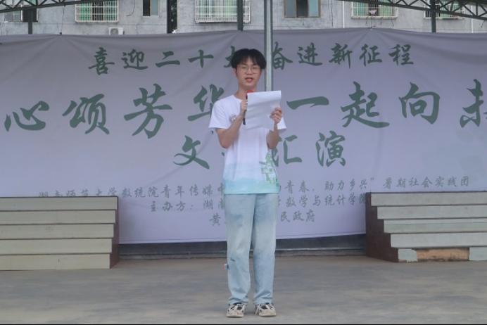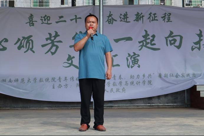 (通讯员 曹慧娟 王琪璇 曾皓楠)7月17日上午,“跃动青春,助力乡兴”——数学与统计学院青年传媒中心赴邵阳市绥宁县暑期社会实践团(以下简称“实践团”)于黄土矿镇同乐社区举行“童心颂芳华,一起向未来”文艺汇演暨结营仪式。黄土矿镇人民政府社会事务综合服务中心副主任刘顺峰,黄土矿镇学校校长袁进农、主任龙华平,同乐社区书记刘天庆、计育专干周喜红出席此次汇演活动。实践团成员高俊威和曹慧娟担任主持人。