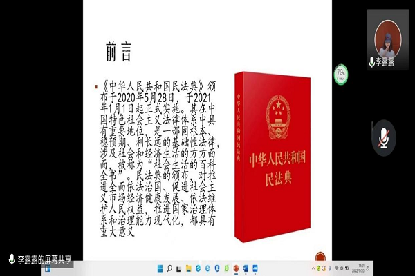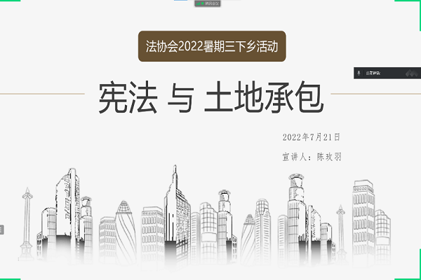 (通讯员 周璧仪 黄佳 匡宇晗)7月22日,法协会开展了“青春建功,助力乡村振兴”脱贫攻坚到村到户活动。因疫情原因,此次活动通过线上的方式开展。理事长黄佳、团支书李露露、理事陈玫羽参与主持此次活动。