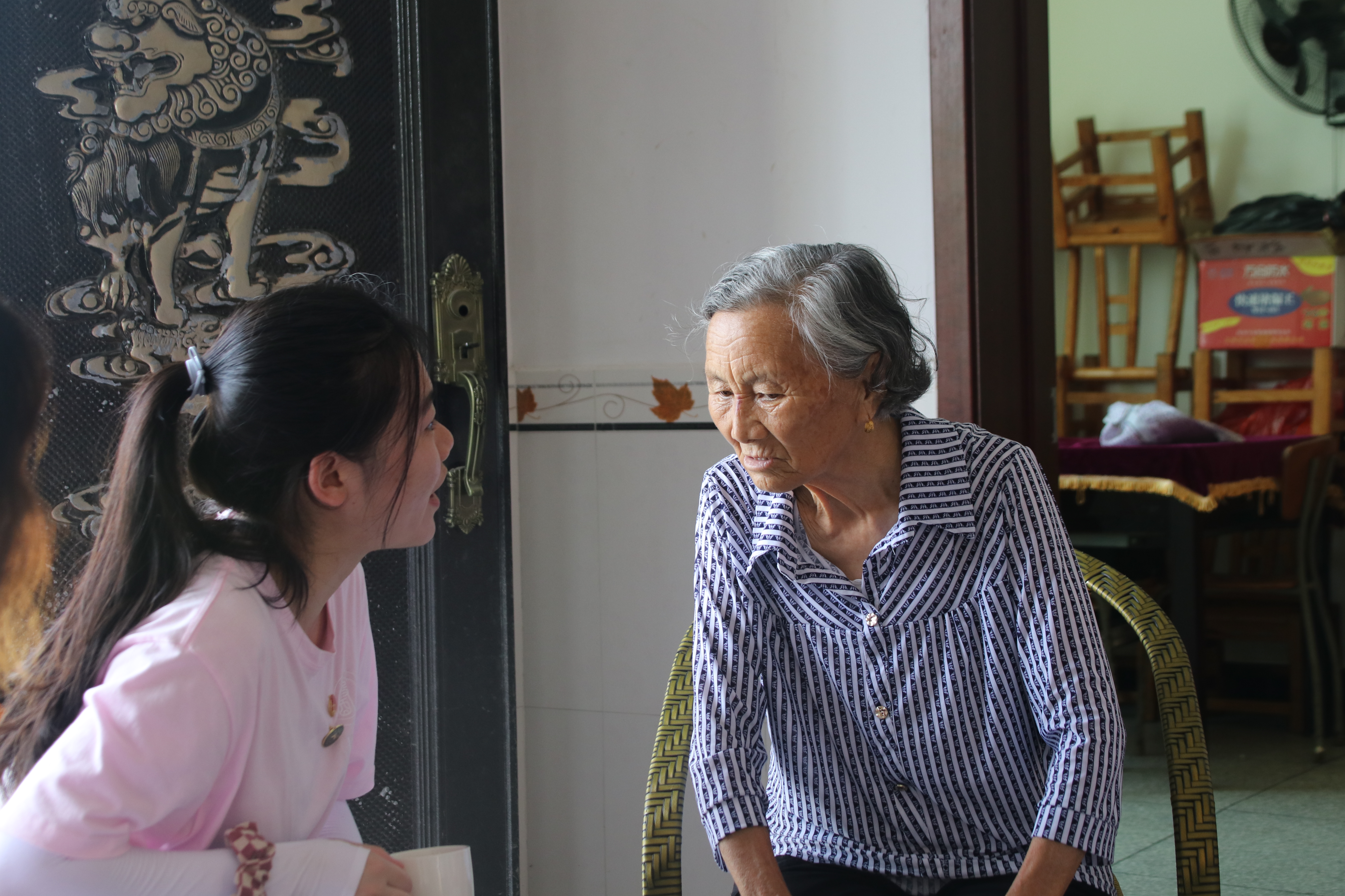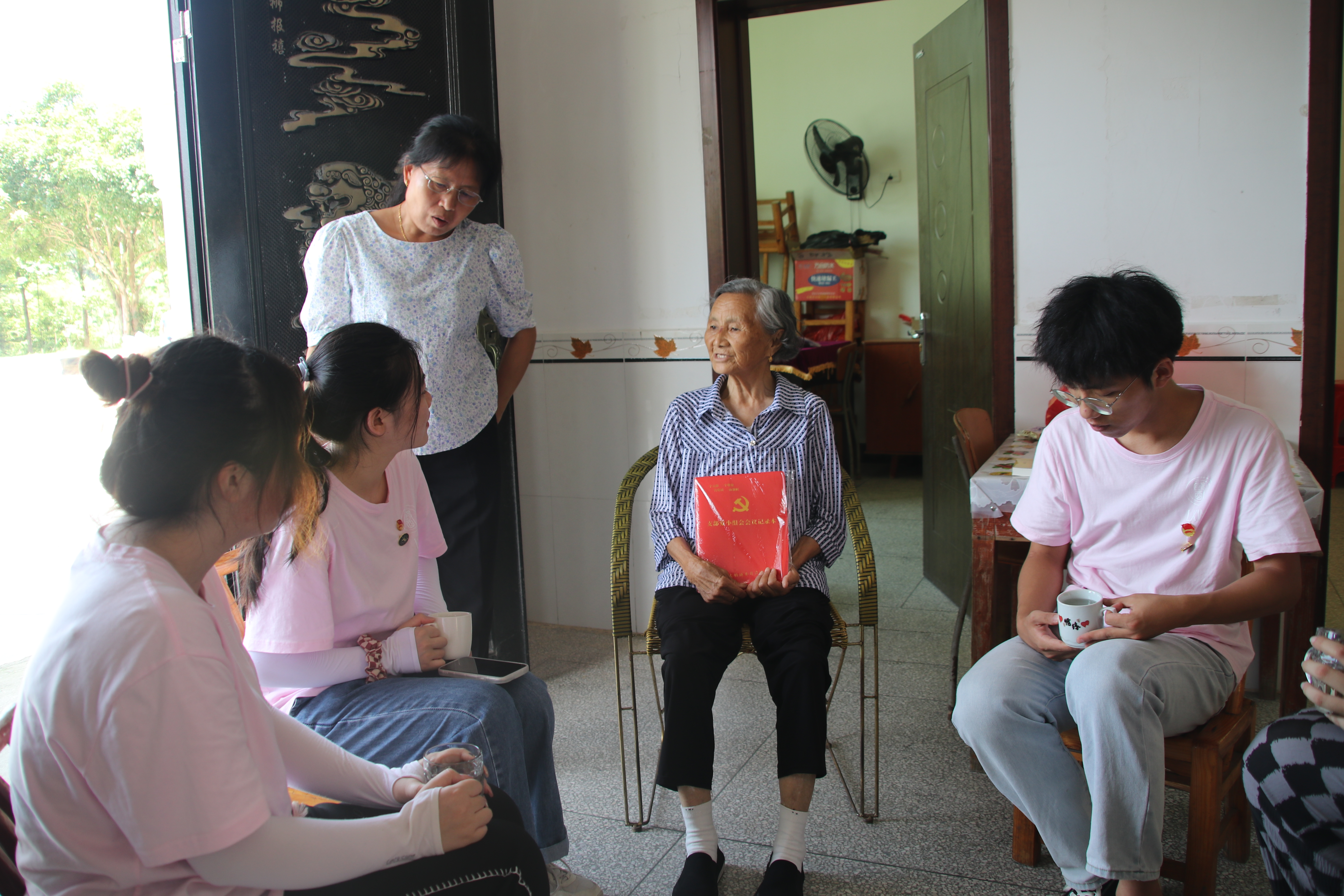 团队一行人前往大塅村慰问具有五十多年党龄的老党员孔凡菊。“天使在人间”队长黎姿详细询问了她的身体状态和生活状况,与她话家常、忆往昔。在探访期间,孔凡菊提到了自己的入党初心。她表示,自己出生的年代重男轻女的社会现象极为严重,当时家中小孩众多难以存活,女生大多被抛弃送走。她当即决定要为女性发声,让女性同胞从此站起来。因此,她决定加入中国共产党,深入基层,听取广大妇女同胞的声音,向大家证明女性也可以为了共产主义奋斗终身。她已经在村中担任妇女主任三十多年,其间带领村中女性努力拼搏,争取成为生产队队长。她也向大家分享了担任共产党员时为人民做出的贡献,比如在村民小孩溺水时第一时间冲下水中救助等等。