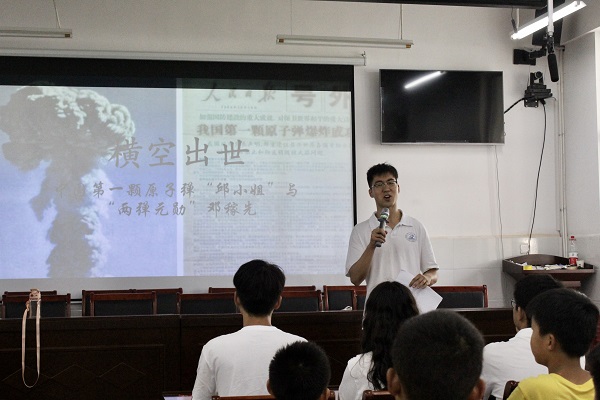 会议伊始,华中科技大学的主讲人杨明远带来了两弹元勋邓稼先的故事。青年邓稼先将西方先进技术带回祖国,身先士卒测试原子弹,即使核辐射严重透支了他的生命,他依旧在最后一刻都念着核事业。杨明远告诉孩子们1964年10月16日戈壁滩上一声巨响的背后是无数老一辈革命家鞠躬尽瘁的伟大成果,是让中国人民挺直腰杆的关键一招。“如果有来世,我还选择中国,选择核事业。”杨明远介绍完邓稼先留下的最后一句话后,孩子们之间发出了雷鸣般的掌声。孩子们都被这样一位求学报国、以身许国、铸剑护国、丹心耀国的爱国英雄所震撼,也对“热爱祖国、无私奉献,自力更生、艰苦奋斗,大力协同、勇于登攀”的两弹一星精神有了更为深刻的理解。