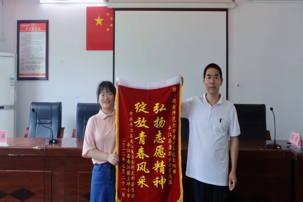 平江县南江镇百合村支部委员以及平江县南江镇上坪小学对近期实践团成员的付出表示肯定,并赠送题有“绽放青春风采,弘扬志愿精神”的锦旗。村主任方平江及校长曾庆春向实践团队员表达了诚挚的感谢及衷心的祝福,祝愿同学们不忘教育初心,胸怀美好憧憬,在未来学习生活中砥砺前行。