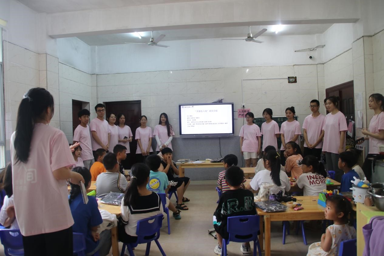 见面会正式开始,队长对同学们的到来表示欢迎,并介绍“天使在人间”队伍的归属学校、建设目标、成员组成等基本情况。支教组组长兼班主任简要讲述暑期课程的大致安排,包括来校和离校时间以及课程时长。每名队员按照名单,依次上前进行自我介绍,他们亲切而幽默的表达迅速拉近了师生的距离。随后,小朋友们轮流进行自我介绍,每位学生所对应的小小老师为他们送上书包作为见面礼。为了确保孩子们可以认出一对一指导老师,黎姿通过抢答赢奖励的方式抽查同学们是否识得每位小老师,孩子们自觉遵守游戏规则,积极抢答,为整个班级营造了轻松愉快的氛围。开学典礼结束,学生和老师们在幼儿园门口合影留念,统一放学后,队员们一对一护送小朋友安全回家。