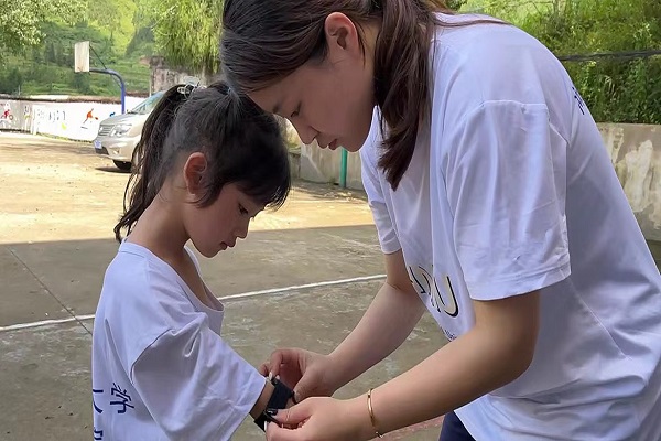 “领梦者”实践团成员为实践地学校学生佩戴体智能校体通智能穿戴设备