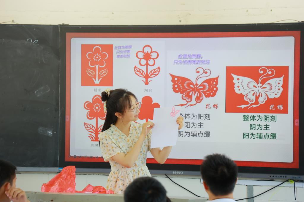 实践团成员朱楠宜正在给同学们讲解剪纸的相关知识