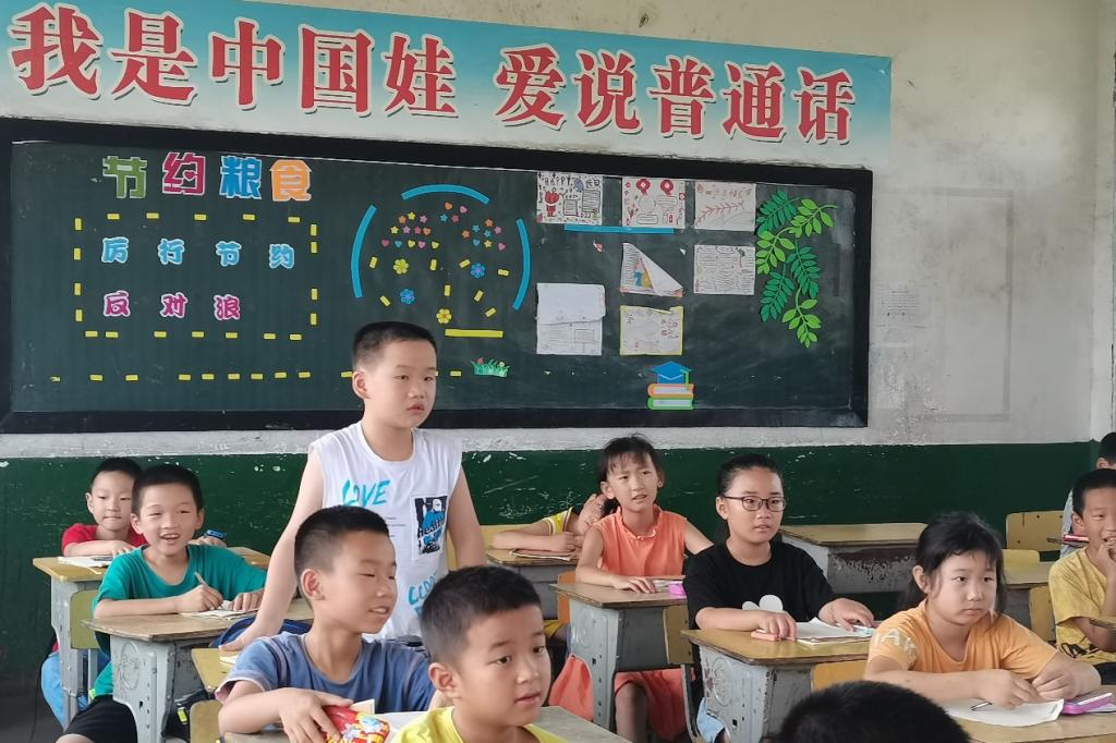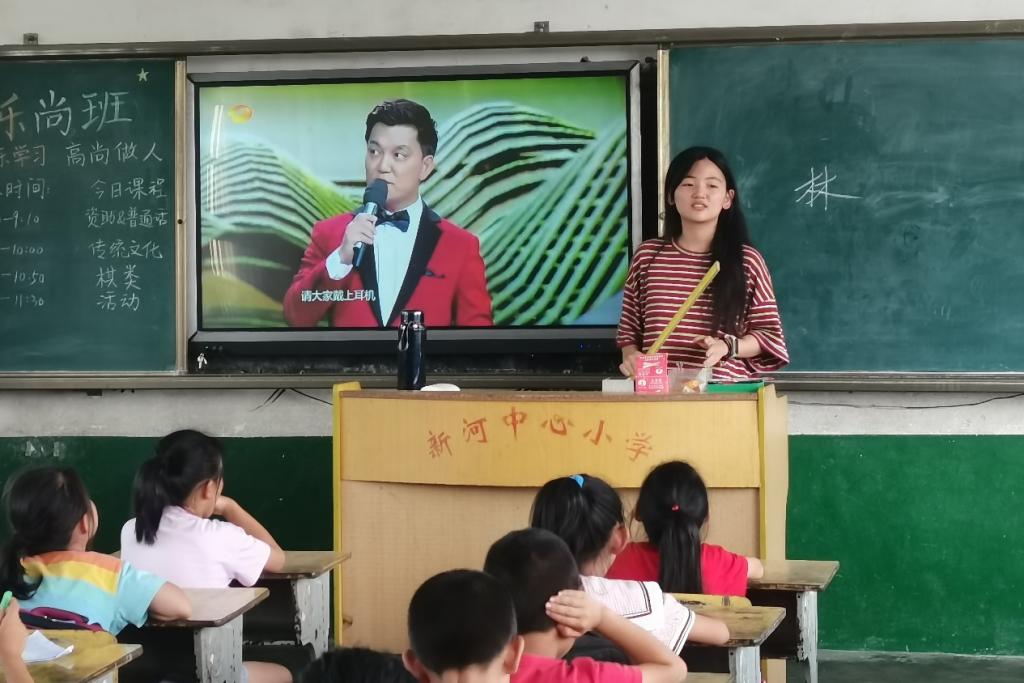 (通讯员 李昭含)7月14日上午,太阳成集团tyc赴岳阳华容县新河乡中心小学暑期实践团举行推广普通话主题宣讲会。此次会议由生活组组长林记荣主讲,全体学生参加。