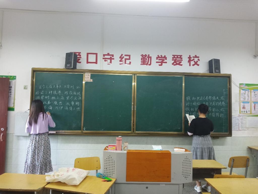 项目负责人廖慧简要介绍了粉笔字书写在教师教学实践中的重要意义,成员进一步明确了粉笔字技能对于教师职业重要性,并坚定了练好粉笔字的决心。知行合一团队成员挑选教育性强的文本进行粉笔字书写,并相互交流和点评。在粉笔字书写和交流过程中,团队成员进一步明确了自身的优点与不足,并针对不足提出了优化的建议,为提升师范技能打下了基础。