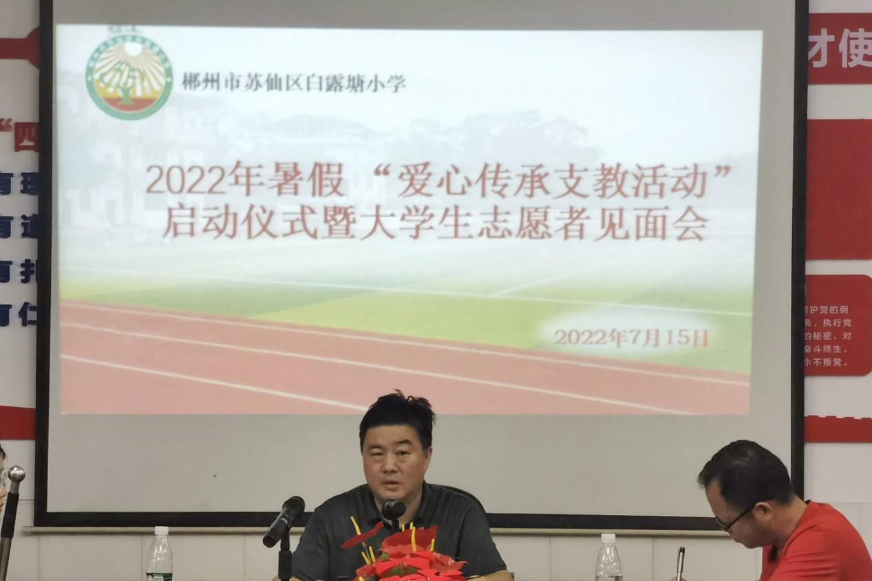 (通讯员 宁玲惠 赵曼 刘智慧)7月15日下午,生命科学学院三叶草园艺社赴郴州市苏仙区白露塘小学暑期社会实践团与白露塘小学校委会成员开展暑假“爱心传承支教活动”启动仪式暨大学生志愿者见面会。白露塘小学校长首林峰担任会议主持人。副校长李吉斌、唐容容、教务办主任文斌、政教处主任陈俐璇、后勤处主任吴代万、办公室主任张红娟、少先队辅导员李思琪参加此次会议。