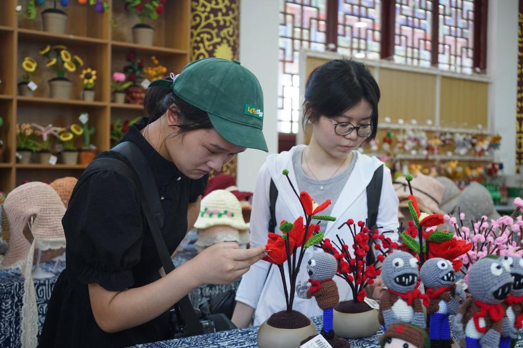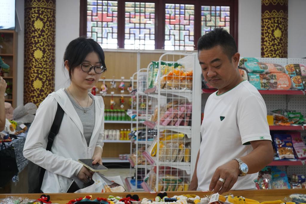 当地织锦文创产品多贴近日常生活,将土家织锦图案放于发饰、包、钥匙扣等小物件上,吸引了大量的游客的注意。调研组成员冯玮林在与店主的交谈中得知,游客经常会询问这些土家织锦图案背后的故事或涵义,而且这些别具匠心的故事往往更能激发游客的购买欲,让他们更有获得感。
